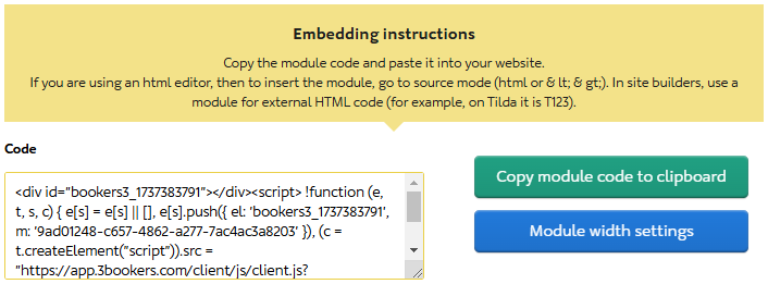 After saving the settings and specifying the width, the code for embedding on the site will appear. You need to copy it and paste it into the page’s source code (html or <>).