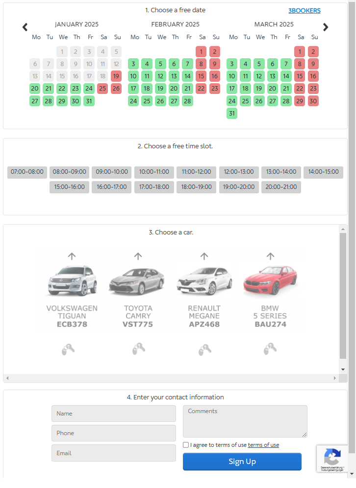 Rental services, transportation, leasing, etc. — ideal for cases where multiple spots are available per time slot. For example, a bus that departs 5 times a day with 20 seats per trip.