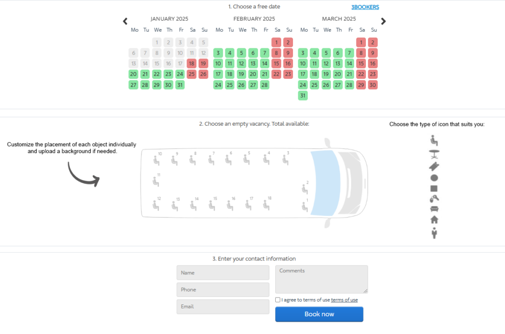 In 3bookers, you can specify the arrangement of tables in a cafe, seats in a concert hall, seats on a bus or minibus, etc. The client selects a day and a seat.